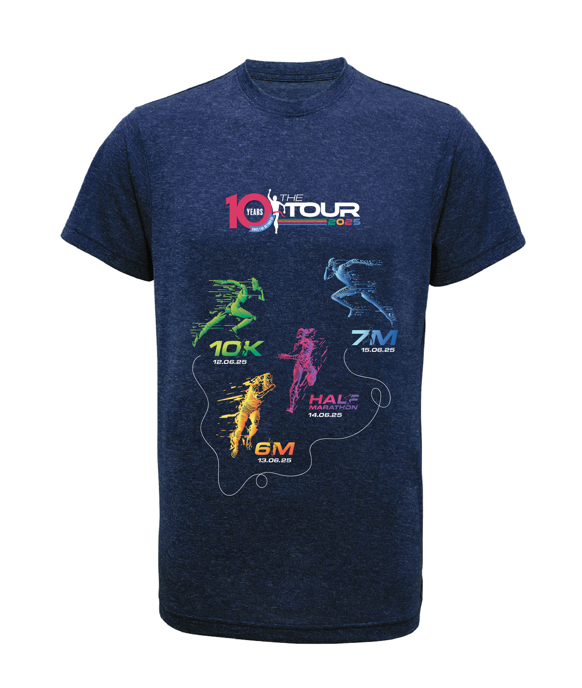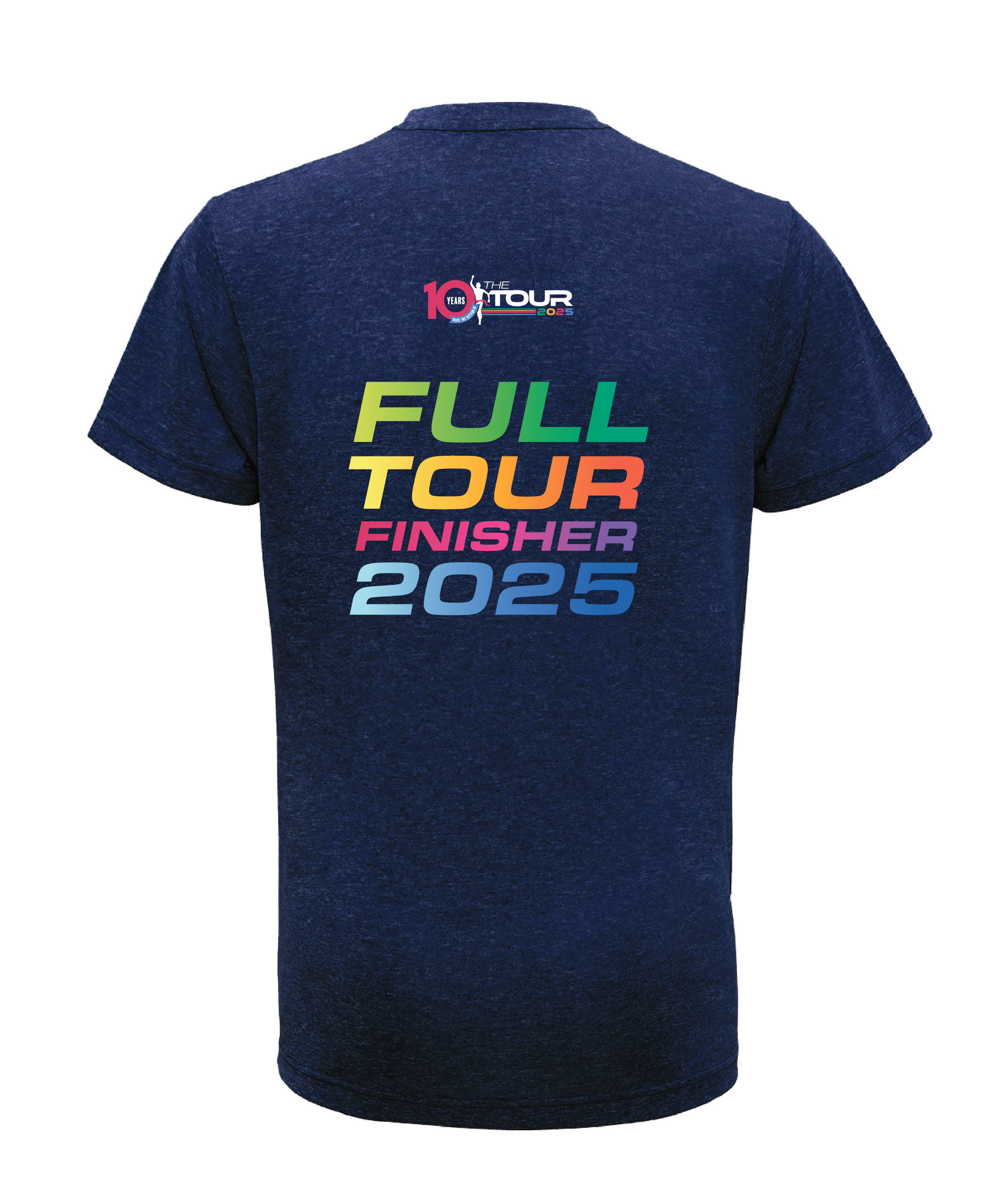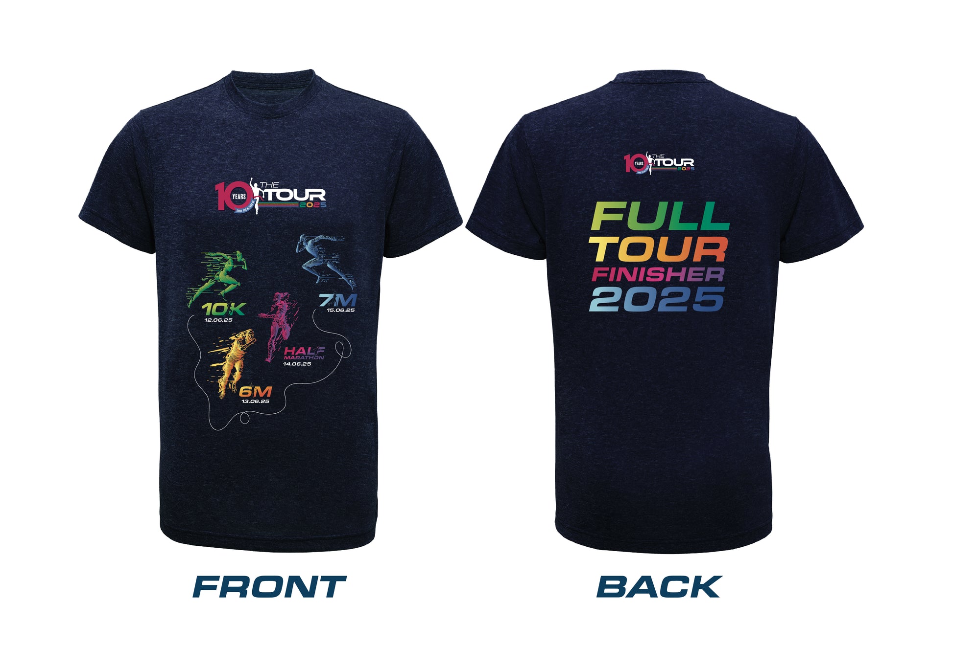 Get ready to celebrate a decade of unforgettable moments with our 2025 Full Tour T-Shirt! This year, all runners participating in the Full Tour can get their hands on a brand-new exclusive design that proudly showcases The Tour’s special 10th Anniversary logo, featuring all four races on the front and ‘Full Tour Finisher 2025’ on the reverse.